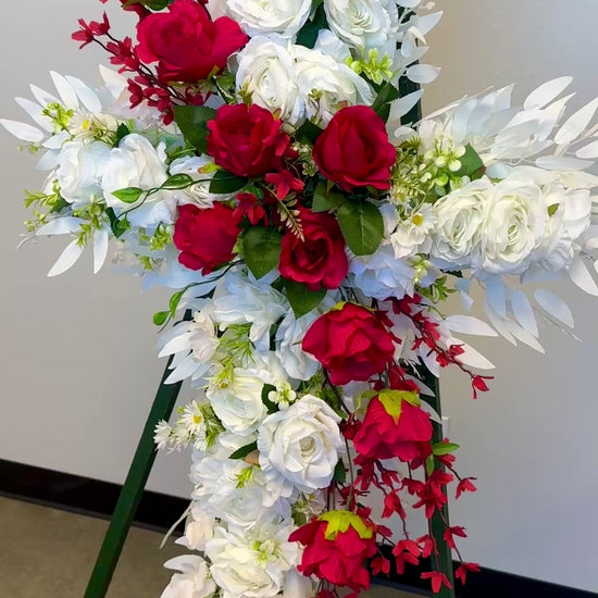 Perfect for funeral homes, memorial events, and funeral services, where an artfully arranged cross-shaped wreath honors loved ones with grace and dignity.